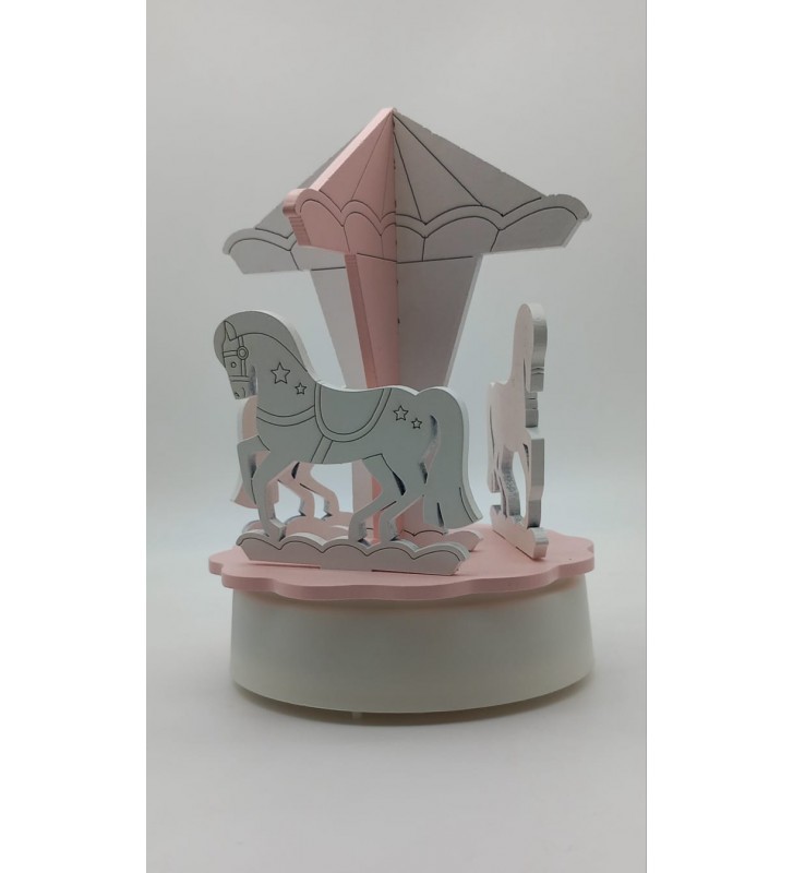 Giostrina carillon con cavallucci in legno, bianca e rosa, completa di astuccio in cartoncino.