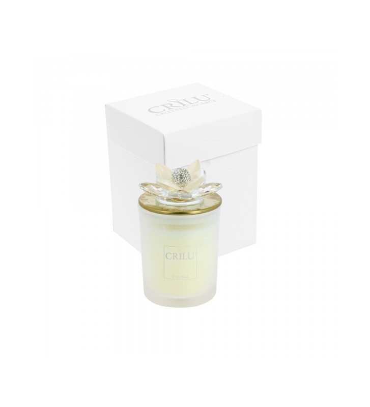 candela panna con vasetto in vetro satinato e tappo gold con applicazione fiore swaroski. Completa di scatola.